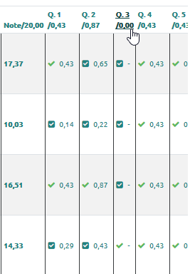 Ainsi tous les étudiants auront le point associé à la question défectueuse. Pour réaliser cet ajustement, reportez-vous à la documentation : Consulter les résultats et ajuster la correction des questions fermées (QCM, vrai-faux, appariement, numérique...) et à réponses ouvertes courtes (QROC)