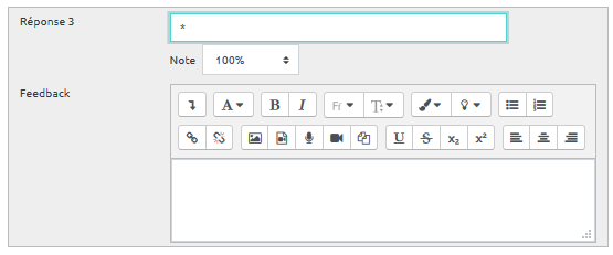 - Pour les réponses courtes, d'ajouter une nouvelle réponse “*” avec une note de 100% comme dans l'exemple ci-dessous :