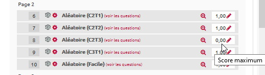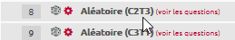 - Si vous souhaitez annuler toutes les questions d'une catégorie, il faut affecter la note “0” aux questions concernées (cela revient à suivre la même procédure que pour les questions non aléatoires décrite plus au dessus). Par exemple, pour annuler les questions d'une catégorie intitulée “C2T3”, il faut inscrire “0” dans les notes des questions aléatoires de la catégorie C2T3, comme ci-dessous :