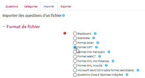 Vous pouvez importer des questions conçues dans un autre espace de cours dans la plateforme voire avec d'autres outils (exemple : exerciseur HotPotatoes, autre LMS, etc.).