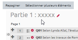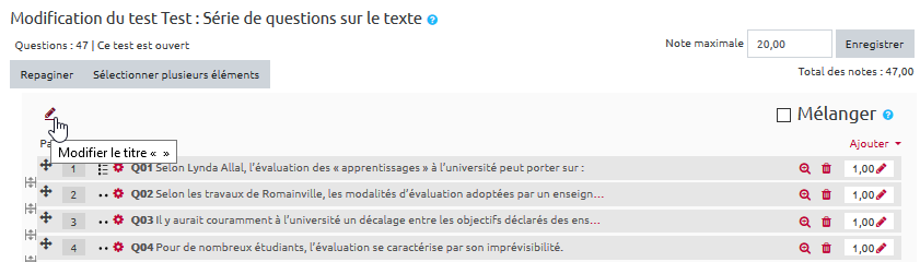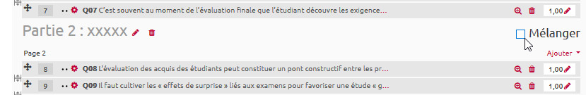 Maintenant que le test est chapitré, l'option “Mélanger” ne brassera que les questions des sections pour lesquelles l'option est cochée :