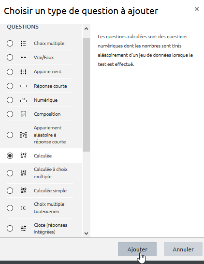 La question “Calculée” permet de proposer, tout comme la question "Calculée simple", un calcul à réaliser avec des valeurs différentes pour chaque nouvelle tentative dans la limite du nombre de jeux de valeurs créé. Pour cela, nous indiquerons entre autres la formule qui permet d'obtenir la réponse attendue, les intervalles des variables utilisées, le nombre de jeux de valeurs à créer et la précision de la réponse attendue.