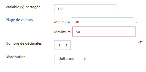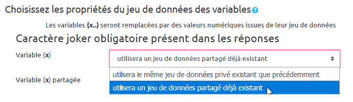 - Techniquement, lors du démarrage d'une tentative, la plateforme sélectionne au hasard une valeur pour chaque variable parmi les jeux de données possibles. La valeur sélectionnée d'une variable reste la même dans toutes les questions utilisant le même jeu de données partagées.