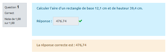 - une tolérance de 0,1 de type Nominal signifie que seront acceptées les réponses comprises dans un intervalle de 0,01 autour de la réponse exacte (+/- 0,1) Appliqué à une valeur réponse de 100, cela signifie que l'on accepte l'intervalle [99,9;100,1]. Ce type de tolérance peut être utile lorsque la différence entre les réponses correctes est petite ;