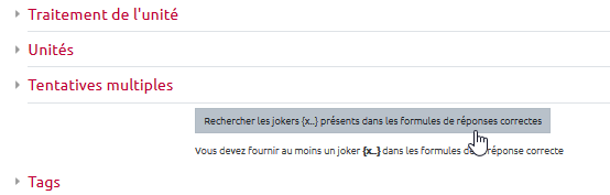 - Tout en bas de la page, cliquer sur “Rechercher les jokers {x…} présents dans les formules de réponses correctes” :
