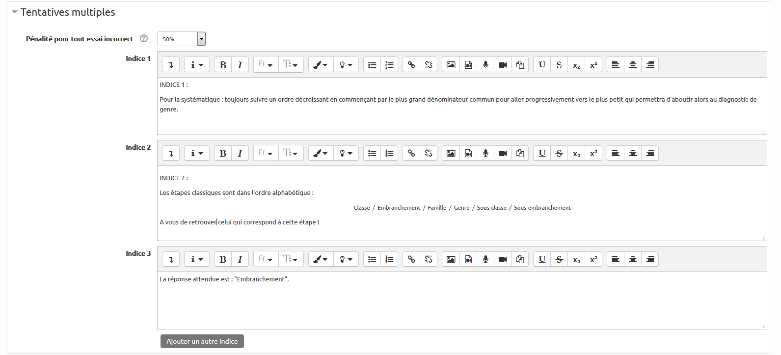 On peut y écrire les indices, qui vont s'afficher dans l'ordre après chaque échec. On peut entrer deux indices par défaut mais il est possible d'en ajouter avec le bouton “Ajouter un autre indice”.