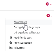 Ou depuis le cours en mode édition, cliquez sur “Modifier” à côté du test, puis sur “Paramètres”.
