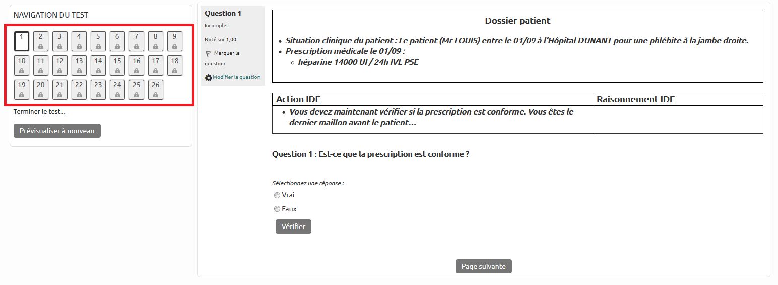 Pour que l'étudiant soit obligé de suivre les questions dans l'ordre, il faut verrouiller la navigation dans le test. Pour cela, on va lier les questions deux à deux en conditionnant l'accès à la suivante à l'accomplissement de la précédente. Le paramétrage s'effectue sur la page de modification du test (“ADMINISTRATION” > “Modifier le test”).