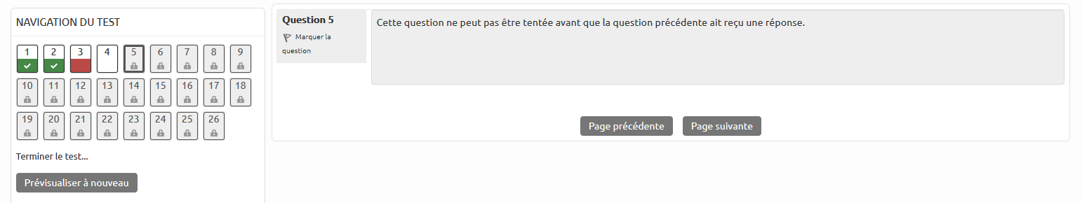 Lors de la conception d'un test, il peut arriver que l'on veuille forcer les étudiants à répondre aux questions dans l'ordre. Cela garantit un contrôle sur la façon dont les connaissances sont évaluées et permet l'utilisation de feedbacks pour dynamiser le test au lieu d'un simple rapport à la fin.