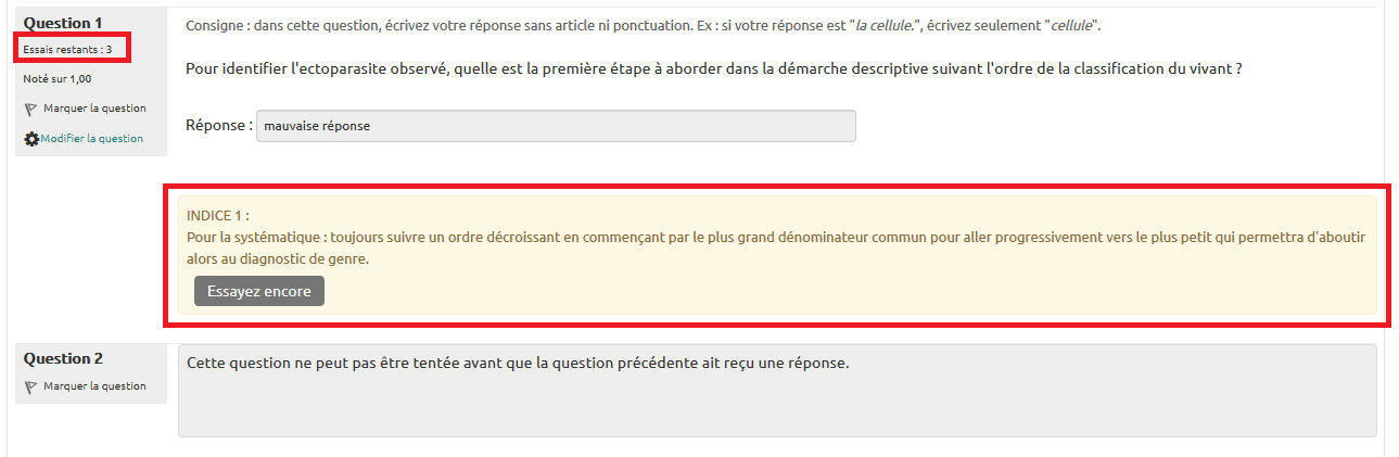 Chaque question avec indices peut être tentée autant de fois qu'il y a d'indices. Autrement dit, si l'étudiant entre une mauvaise réponse après avoir épuisé tous les indices, aucun point n'est attribué et il n'est plus possible de retenter.
