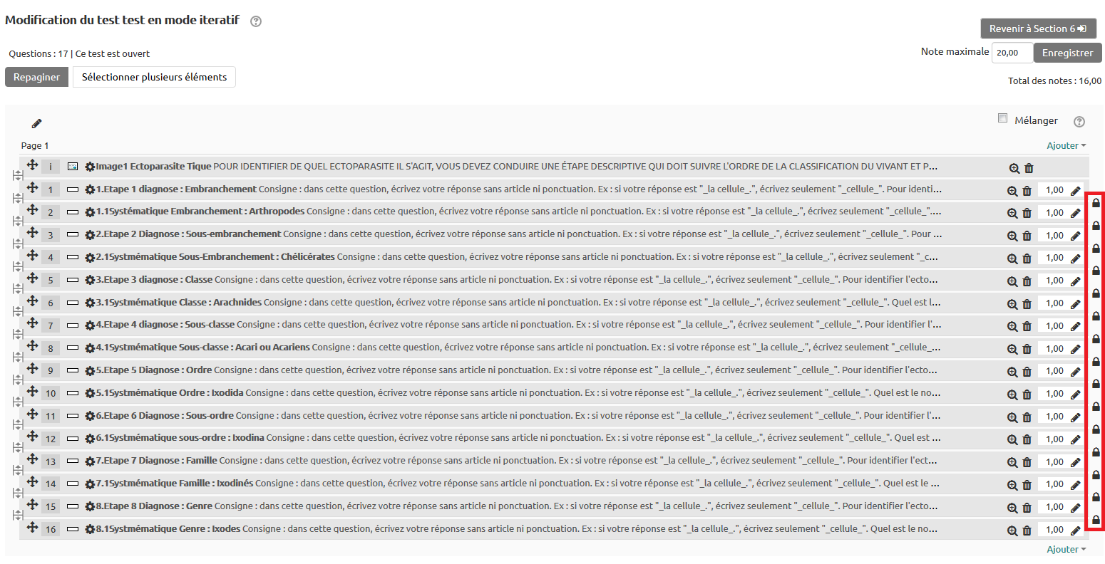 La liste de cadenas à droite de la liste de questions permet de gérer le verrouillage. Par défaut, tout est déverrouillé (cadenas ouverts) : on peut effectuer le test dans l'ordre que l'on souhaite. On va alors cliquer sur chaque cadenas pour verrouiller le passage d'une question à l'autre comme ci-dessus. On peut aussi créer plusieurs suites de questions dans un test (sur un même thème ou une même situation par exemple) et laisser à l'étudiant le choix de l'ordre dans lequel il souhaite aborder les séries de questions (on appelle parfois cela des questions tandems).