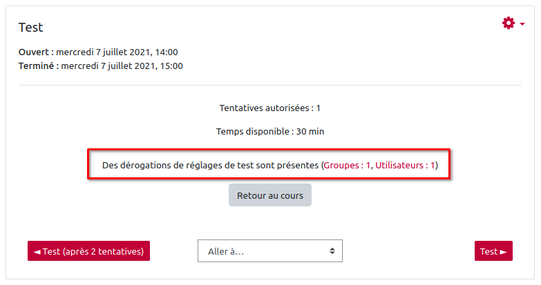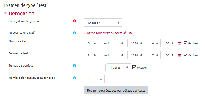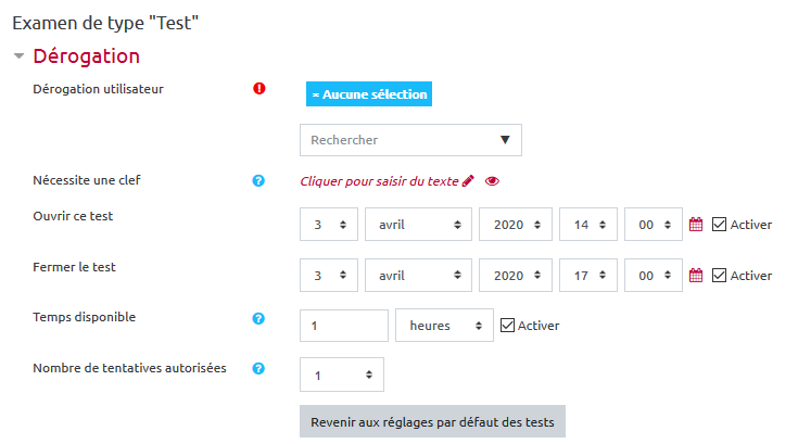 L'interface de dérogation reprend les informations inscrites dans les paramètres du test.