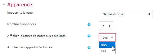 - Sélectionner “Oui” pour afficher le carnet de notes aux étudiants :