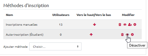 - Vérifier que l’auto-inscription est désactivée (la ligne doit être grisée avec le petit œil barré, sinon cliquer dessus pour désactiver). Ainsi, on verrouille toute possibilité d’inscription dans l’espace de cours.