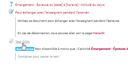 - Préciser aux étudiants qu’ils doivent faire l'épreuve avec leurs codes d’accès à la plateforme Moodle. Préciser qu’ils ne peuvent en aucun cas utiliser le code d’accès d’un autre étudiant du fait que les résultats sur la plateforme sont nominatifs pour permettre la validité de l’épreuve.