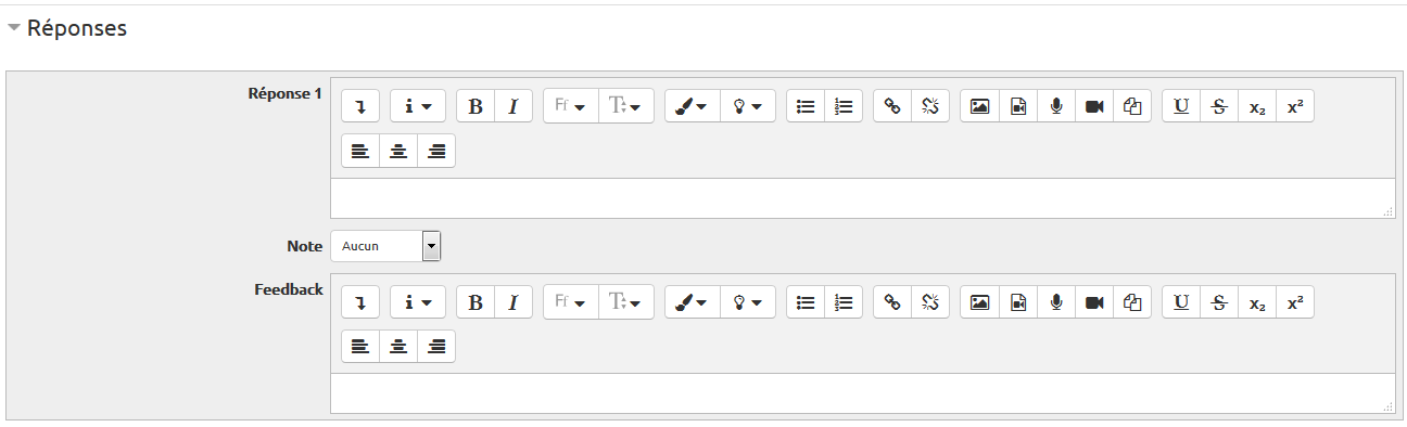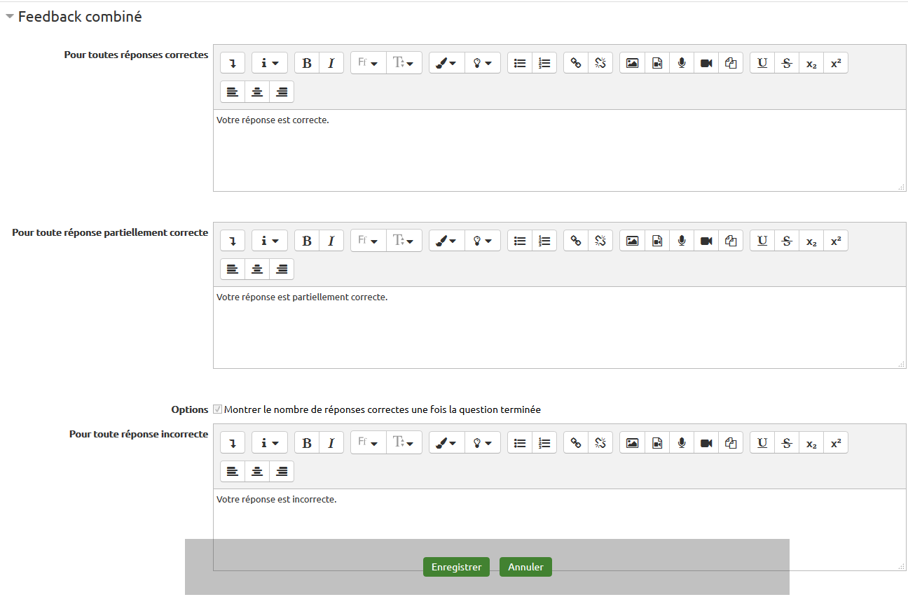Le feedback de chaque réponse ne sera affiché que si l'étudiant coche cette réponse (contrairement au feedback général qui s'affiche à tous). Idem pour questions suivantes. 5 blocs réponses par défaut mais vous pouvez en insérer d'autres.