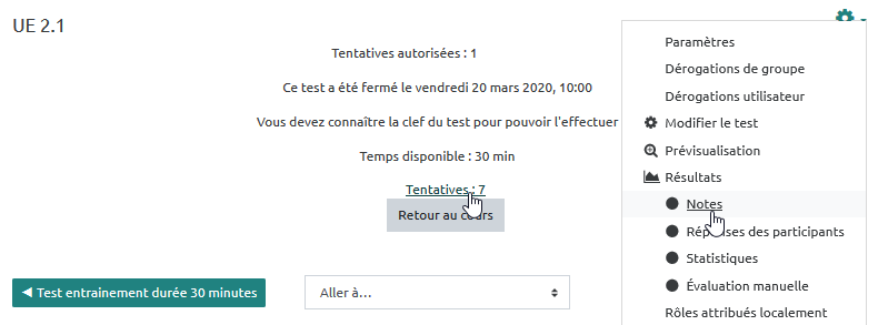 - cliquer ensuite sur le nombre de tentatives ou sur Rouage/Résultat/Notes :