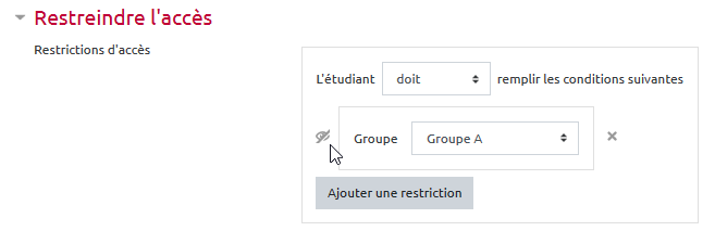 - ajouter une restriction d’accès dans chaque sujet (par exemple : accès au sujet 1 restreint au groupe A) :