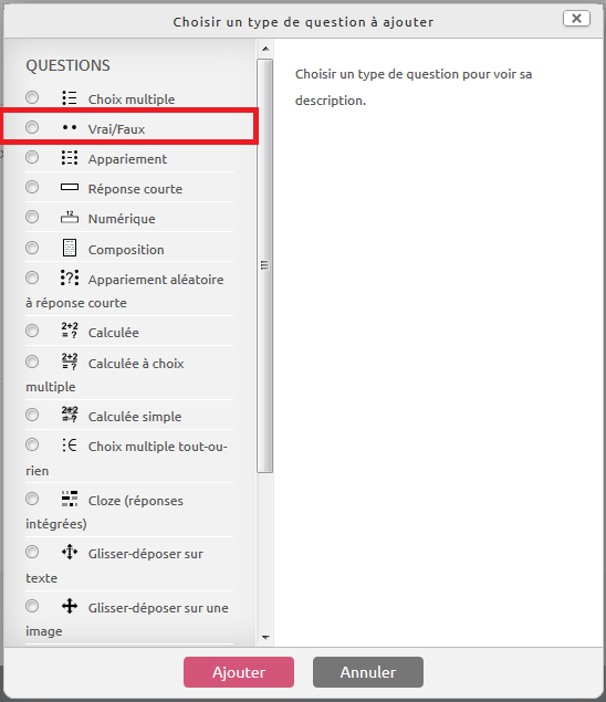 Dans le menu d'ajout de question, choisir l'option “Vrai/Faux” :