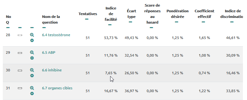L'indice de facilité n'est autre que la taux de réussite à la question. Si un indice de facilité est inférieur à 20%, il est recommandé d'aller relire la question car il pourrait y avoir une erreur dans l’énoncé ou les propositions de réponses.