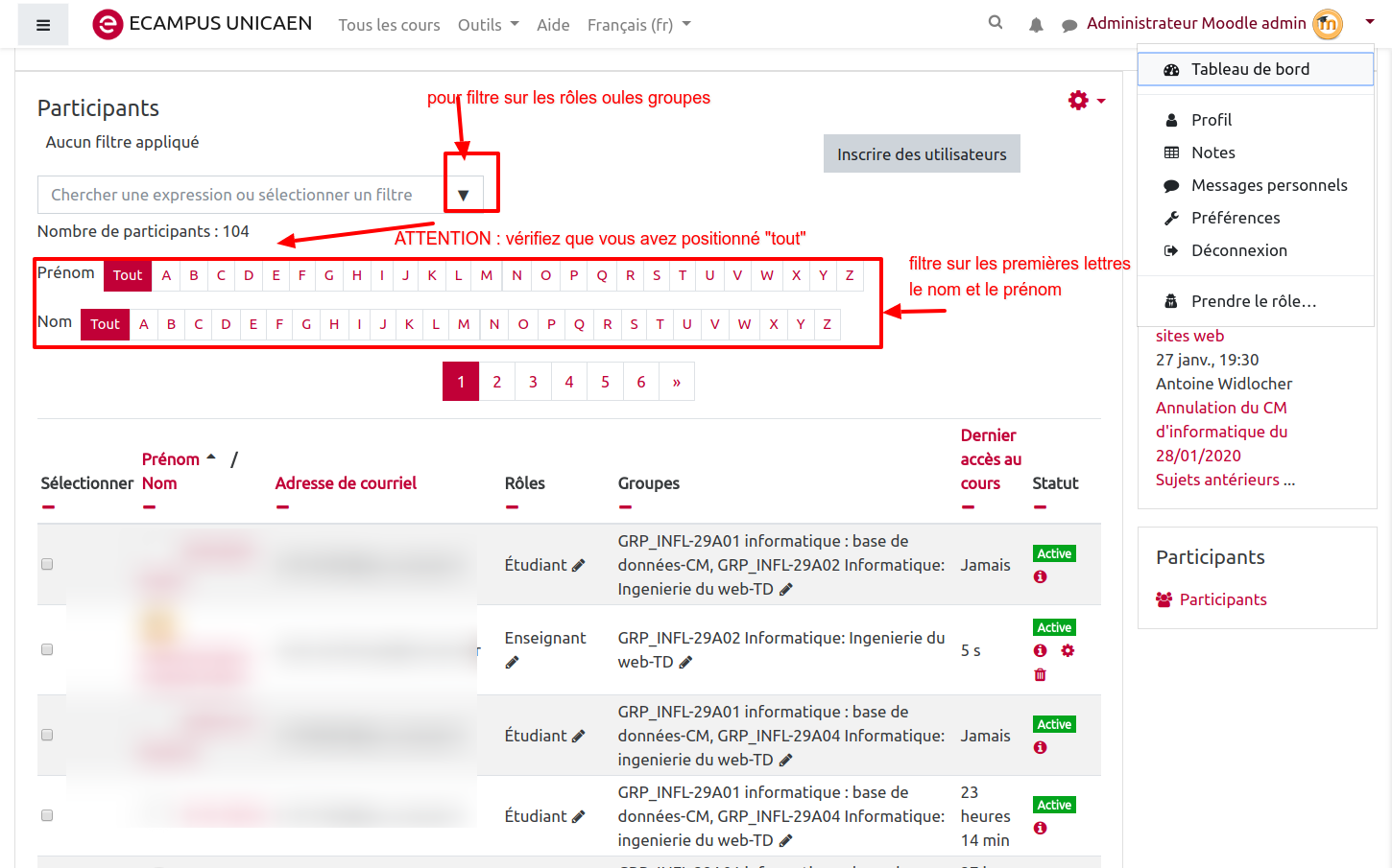 Il est possible de consulter la liste des participants pour vérifier que les étudiants ont bien accès au cours.