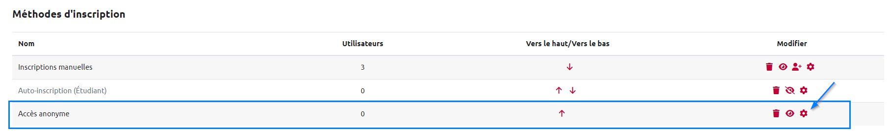 Dans la liste des méthodes d'inscriptions, cliquer sur l’icône de paramétrage (engrenage) :