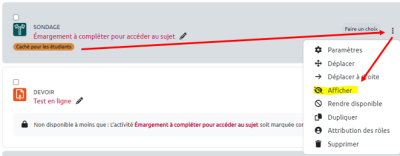 Si la section contenant l’examen est affichée, vérifier que l’activité d’examen est également affichée : sur la droite de la ressource cliquez sur Afficher.
