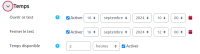 L’accès aux paramètres permet d’ajuster les restrictions notamment au niveau des rubriques Temps pour un test ou Disponibilité pour un devoir, Réglages courants et Restrictions d’accès :