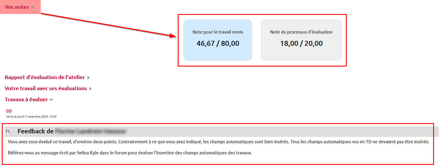 Il continue d'apercevoir son travail remis ainsi que les travaux qu'il devait évaluer. Si vous avez ajouté un feedback à l'une de ses évaluations, celle-ci s'affiche sous le travail évalué concerné :