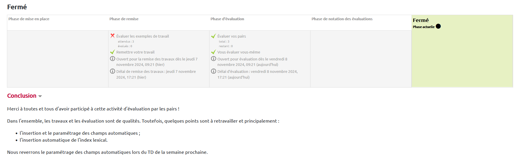 Même si l'activité “atelier” est terminée, l'étudiant voit la phase active dans le tableau des phases :