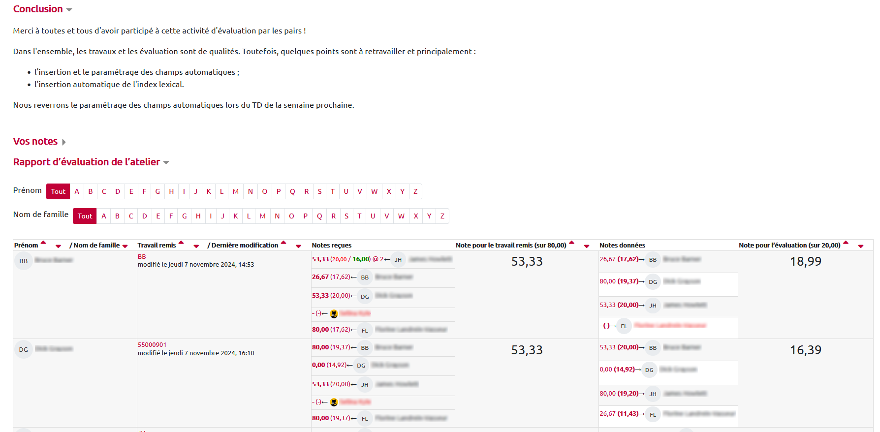 Sous le tableau des phases, l'étudiant voit chacune de ses deux notes : celle obtenue pour le travail remis et celle obtenue pour le processus d'évaluation.