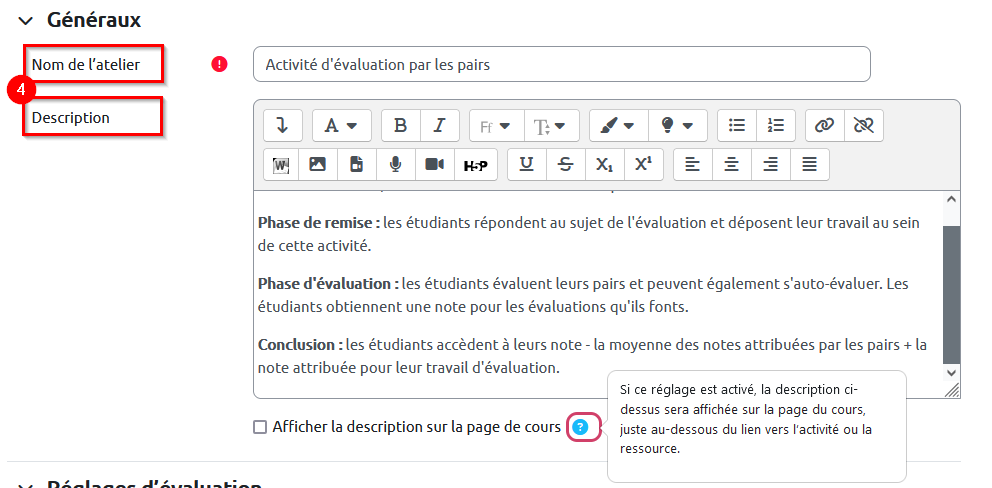 4. Donnez un nom à l’atelier dans le champ « Nom de l’atelier ». Renseignez la « Description » de l’atelier. Cette description sera visible par les étudiants « Phase de mise en place », avant qu’ils puissent remettre leur travail.