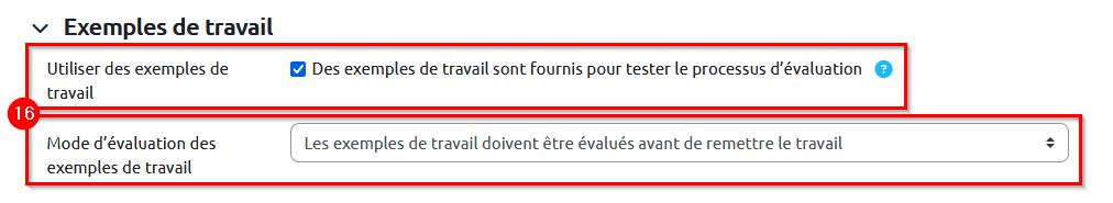16. « Utiliser des travaux exemplaires » afin d’illustrer les attendus de l’activité. Cochez « Des travaux exemplaires sont fournis pour tester le processus d’évaluation », puis sélectionnez le « Mode d’évaluation des travaux exemplaires ». Pour permettre aux étudiants de profiter des travaux exemplaires avant qu’ils rendent leur travail, sélectionnez « Les travaux exemplaires doivent être évalués avant de remettre le travail ».
