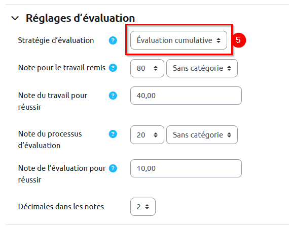 5. Dépliez la rubrique « Réglages d’évaluation » et sélectionnez la stratégie d’évaluation la plus appropriée. « Évaluation cumulative » permet aux étudiants de donner une note pour chacune des composantes de l’évaluation et d’ajouter un commentaire associé cette note, donc de justifier la note attribuée. À l’issue de l’activité, les étudiants obtiendront deux notes : une pour le travail qu’ils ont remis (par défaut 80) et une pour la qualité de leur évaluation (par défaut 20).