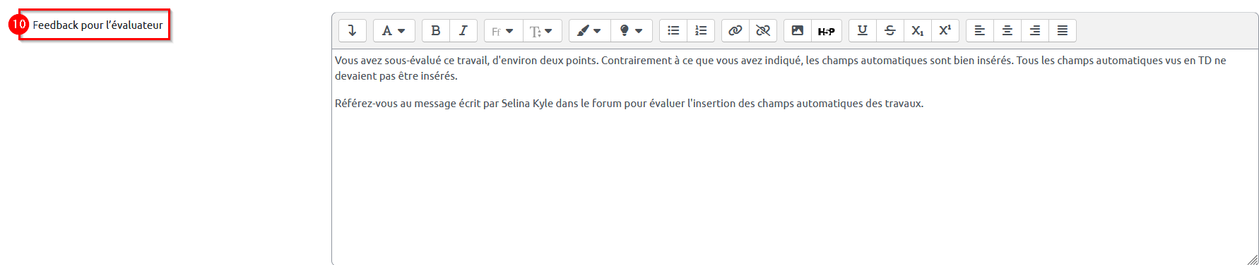 10. Complétez le champ « Feedback pour l’évaluateur » afin d’expliquer à l’étudiant évaluateur pourquoi vous avez modifié la note qu’il avait attribué précédemment.