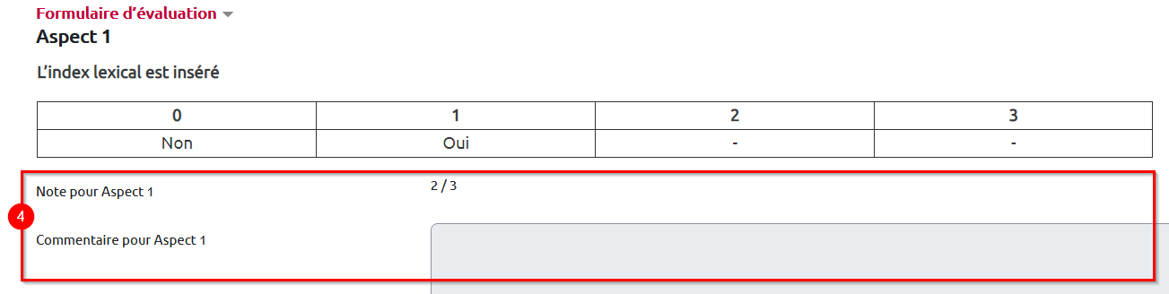 Ensuite, l'étudiant complète le formulaire d'évaluation. Il sélectionne une note (obligatoire) et saisit un commentaire (facultatif) pour chacun des “Aspects”, des critères d'évaluation :