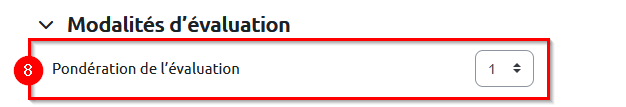 8. Faites défiler la page de l’évaluation jusqu’à atteindre les « Modalités d’évaluation ». Pondérez la modification de la note en sélectionnant un nombre dans le menu déroulant du paramètre « Pondération de l’évaluation ».