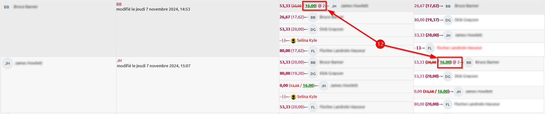12. De retour au tableau « Rapport d’évaluation de l’atelier », chaque note modifiée apparaît en vert dans les colonnes « Notes reçues » et « Notes données ». La pondération est visible sur les mêmes lignes, précédée du signe @.