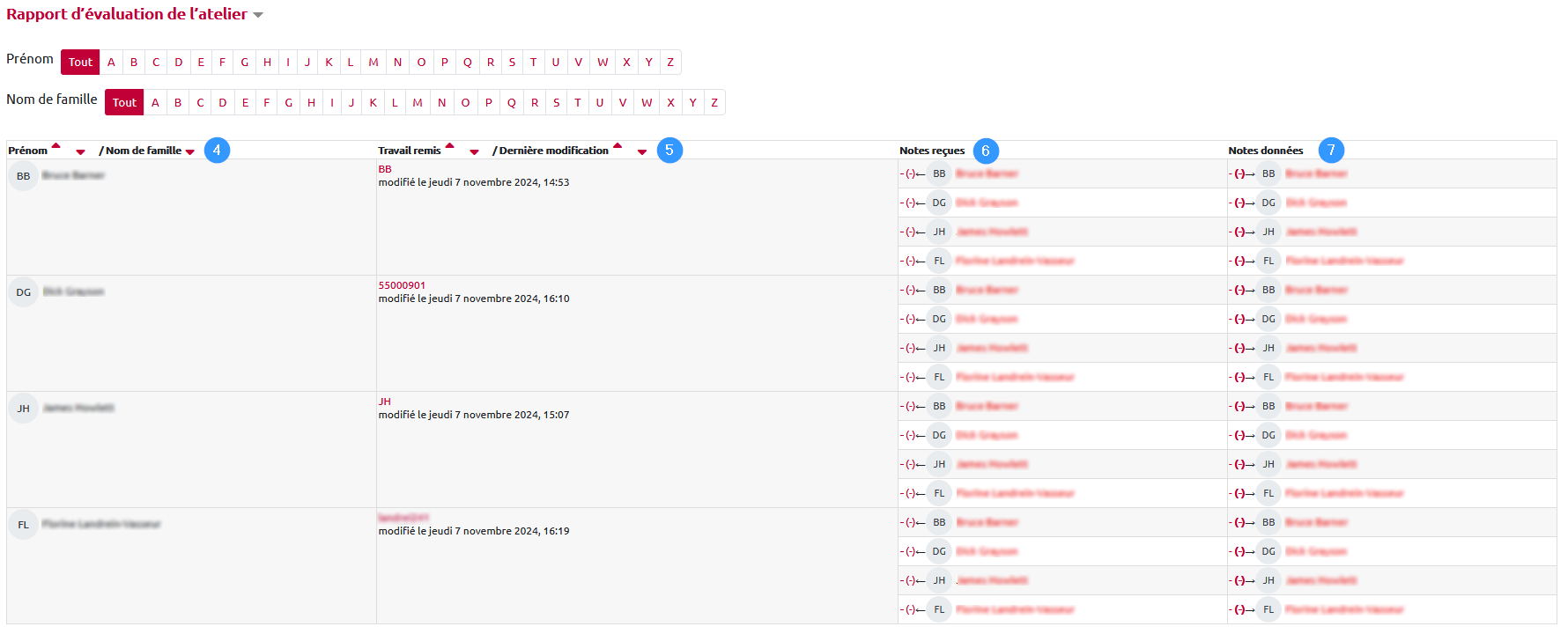 7. Pour modifier une note donnée par un étudiant, cliquez sur la note correspondante dans la colonne « Notes reçues » ou « Notes données ».