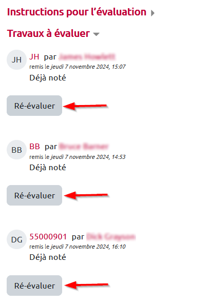 Aussi longtemps que la phase d'évaluation est active, l'étudiant a la possibilité de revenir sur ses évaluations. Il clique sur l'un des boutons gris “Ré-évaluer” pour modifier les notes, commentaires et feedbacks déjà donnés.