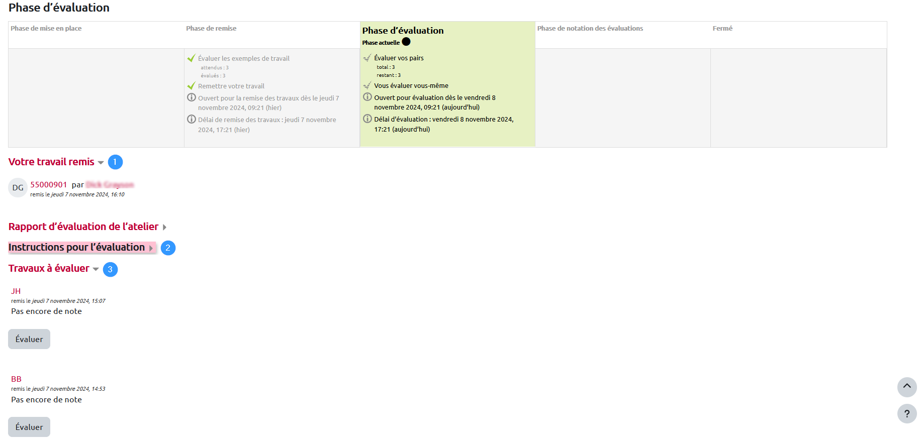 Comme l'enseignant, l'étudiant voit le tableau des phases et la phase active. Lors de la phase d'évaluation, l'étudiant voit également le travail qu'il a remis (son titre et la date de dépôt)