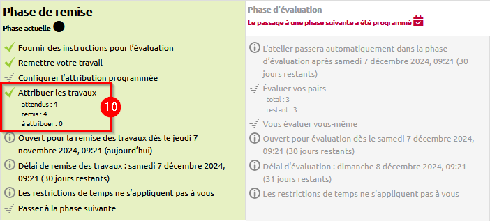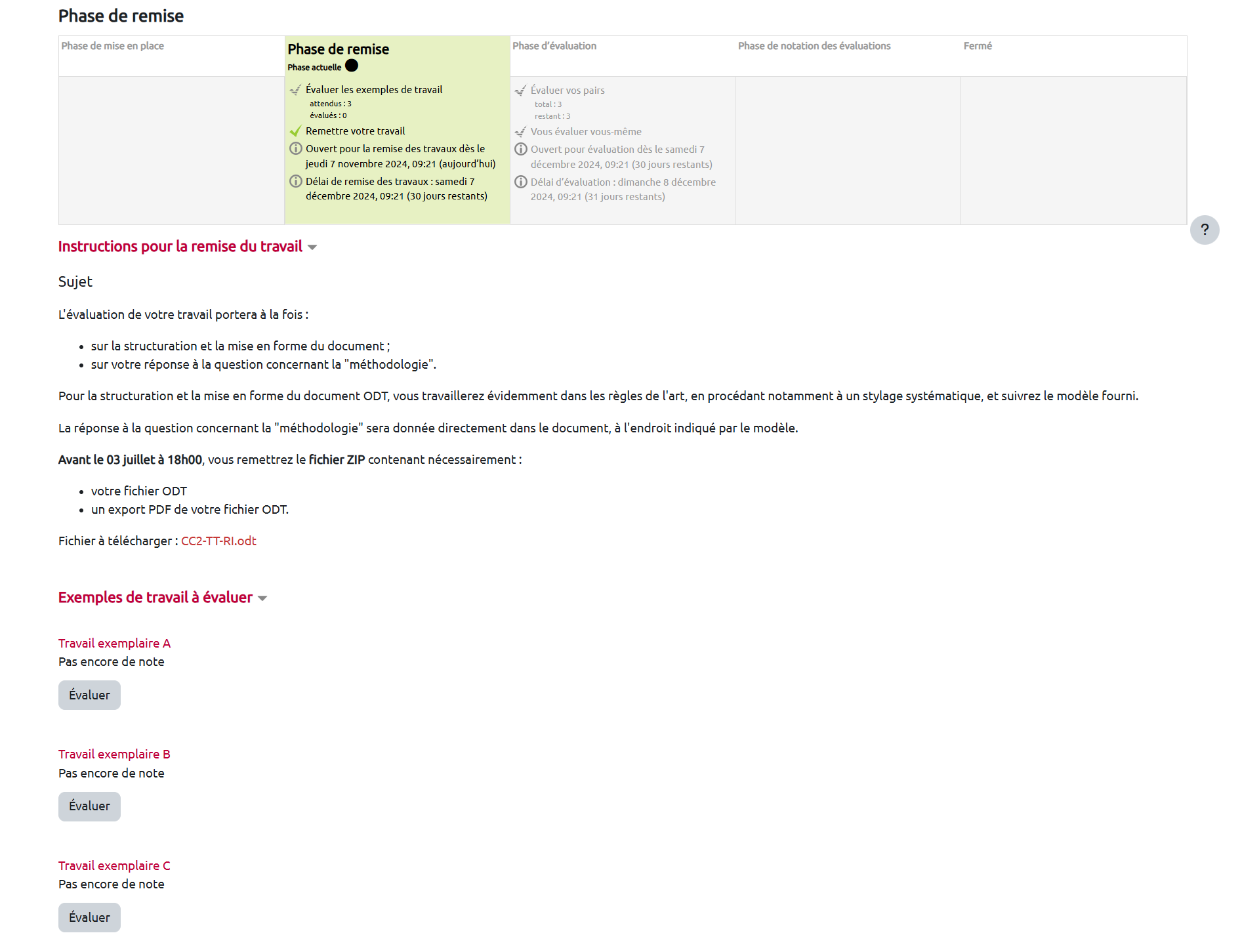 Comme l'enseignant, l'étudiant voit le tableau des phases et la phase active. Lors de la phase de remise des travaux, l'étudiant voit également les “Instructions pour la remise du travail” ainsi que les travaux exemplaires à évaluer :
