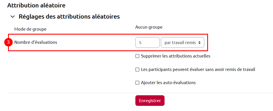 Pour le paramètre « Nombre d’évaluations », sélectionnez le nombre de travaux que devra évaluer chaque étudiant – « par travail remis » – ou combien de fois chaque travail sera évalué – « par évaluateur » – dans les menus déroulants prévus à cet effet.