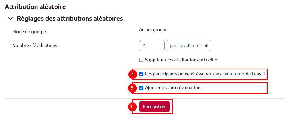Cochez la case « Ajouter les auto-évaluations » pour que chaque étudiant évalue son travail en plus de ceux de ses pairs.
