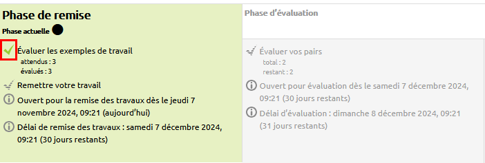 Quand les travaux exemplaires ont été évalués, la ligne “Évaluer les exemples de travail” du tableau des phases est précédée par une icône représentant une coche verte.