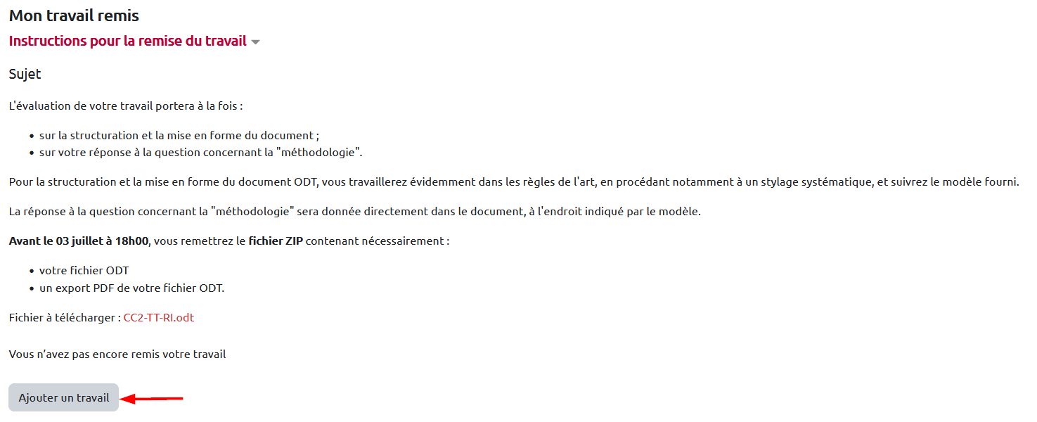 L'étudiant clique sur le bouton “Ajouter un travail” pour déposer sa production :