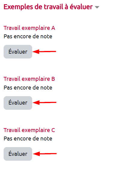 Pour évaluer les exemples de travail, l'étudiant clique sur le bouton gris “Évaluer”, associé à chacun des travaux exemplaires à évaluer.