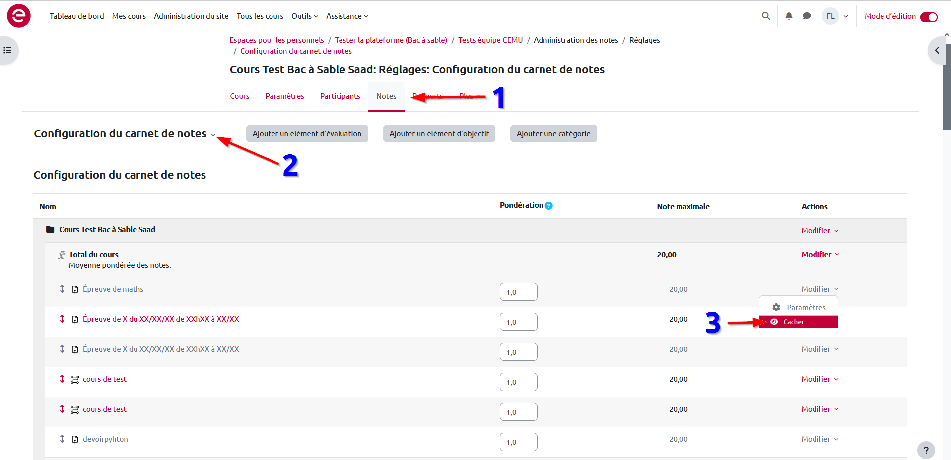 - Enfin sélectionner l'activité dont on souhaite cacher la note et puis cliquer dans le menu déroulant, sur cacher.