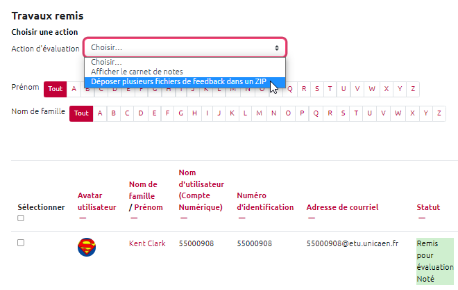 - déposez ce fichier compressé (.zip) via la page listant les devoirs en sélectionnant l'action d'évaluation “Déposer plusieurs fichiers de feedback dans un ZIP” :