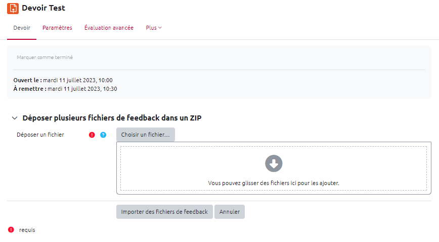 Dans l'interface de visualisation des devoirs, vous pouvez, pour chaque étudiant, lui déposer un fichier de correction de son devoir. Cette opération peut être fastidieuse, car vous les déposez un à un.
